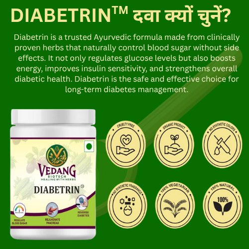 Diabetrin is a natural Ayurvedic powder specially formulated to help manage diabetes by regulating blood sugar levels. It combines powerful herbs like Jamun, Karela, and Methi to support insulin function, boost energy, and improve overall diabetic health.